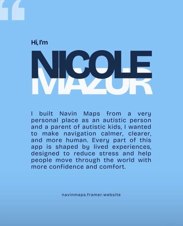 This project is driven by lived experience. As an autistic woman, parent and advocate, I understand the real-world challenges people face when trying to move through unfamiliar spaces. NavinMaps exists because current navigation tools were not built with us in mind.